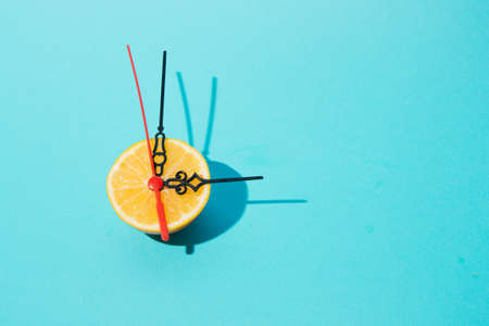 Creative and trend idea with clock hands-on lemon with turquoise Background. Minimal composition.