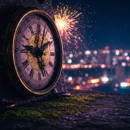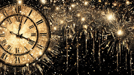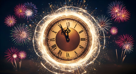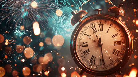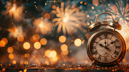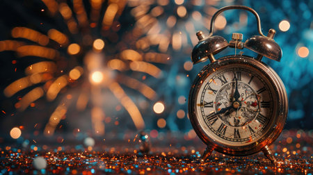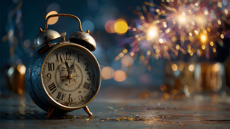 An antique alarm clock stands prominently in the foreground, displaying a time close to midnight. In the background, vibrant fireworks illuminate the night sky, capturing the essen