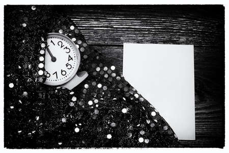 Black and white vintage image. An empty letterhead on an old wooden table next to a clock and a shiny festive fabric with silver sequins. Holiday concept in retro style