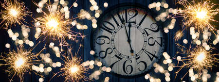 Clock on a grey background with sparkles shows 12 o`clock on New Year`s Eve