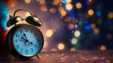 An alarm clock with confetti and bokeh lights in the background, symbolizing a New Year's Eve celebration. --ar 71:30 --v 6.1 Job ID: c0baf186-d997-456a-b41a-7098867405e4