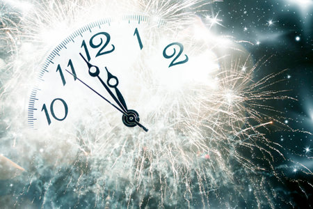 clock at midnight and fireworks New Year's eve celebration