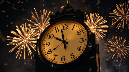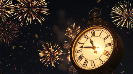 A vintage clock counting down the final moments to midnight as fireworks explode in the background, celebrating the arrival of the New Year with a festive atmosphere.