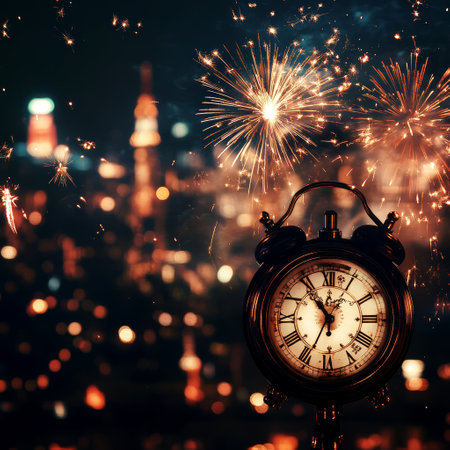 Vintage Alarm Clock Amidst Festive Fireworks and Glowing Bokeh Lights
