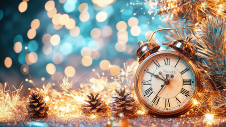 A classic alarm clock strikes midnight beside a champagne glass, pine cones, and festive ornaments, surrounded by sparkling bokeh lights, celebrating the arrival of the New Year.