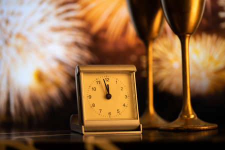 Champagne flutes and clock on the background of fireworks and crowd celebrating New Year