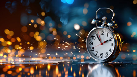 A dynamic close-up image of a vintage alarm clock positioned against a backdrop of colorful bokeh lights and sparkling sparks, symbolizing urgency and the relentless passage of time.