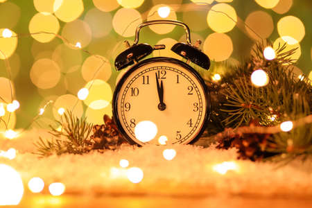 New year composition with alarm clock and beautiful bokeh in the background.