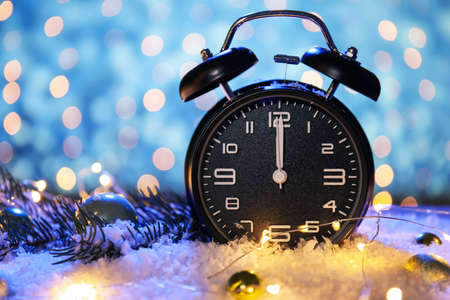 Alarm clock on dark background with bokeh lights. New Year concept