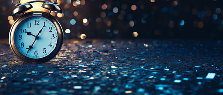 Vintage alarm clock with confetti and bokeh lights in the background, symbolizing a New Year's Eve celebration. The scene is set against a dark, blurred background, creating an atmosphere of joyous anticipation for another day filled with possibilities. This stock photo perfectly captures the festive spirit, offering it as one exquisite element to be used in your creative projects. It's perfect! --ar 71:30 --v 6.1 Job ID: 93302fac-6871-49d1-a308-3ab6ea0fa137