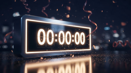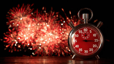 A vibrant countdown timer in the foreground marks the countdown to midnight while colorful fireworks illuminate the night sky in celebration.