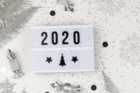 figures 2020 on light box with white snowflakes, silver tree branches and decorations on white background with gold stars. xmas and new year card top view flat lay close up