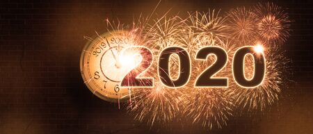 2020 New Years eve celebration. Minutes to midnight on an old watch, bokeh festive background, banner