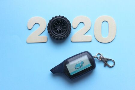 2020. The concept of the new year. The figures 2020 are isolated on a blue background, instead of the number 0 car wheel. New year background, copy space.