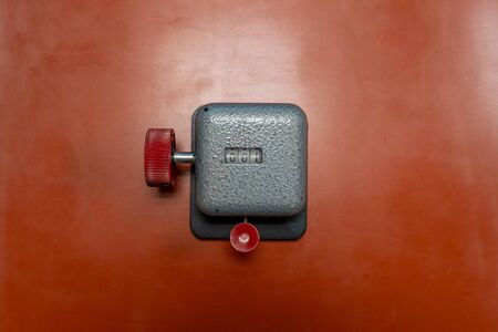 Miniature safe deposit with a code lock and wooden block number. Bank deposit and security concept