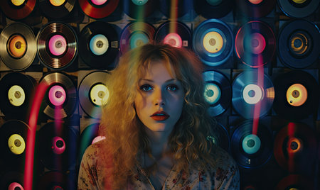 Girl is a movie fan with neon lights and colorful records backdrop. Blonde in vibrant room with CDs, camera lens, and video recorder. Created with generative AI tools