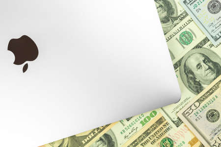 Apple Macbook Pro and Air. Modern laptop on the MacOs and M1 chip. business background with dollar money