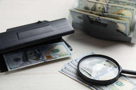 Modern currency detector with dollar banknotes and magnifying glass on white wooden table. money examination device