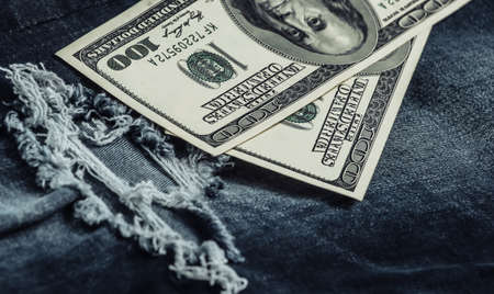 Man hands hold torn money US dollars on a black background, close-up. USA cash in the dirty hands of an american poor man on a dark background