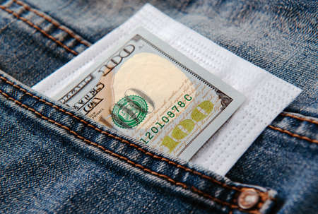 Two hands holding or gives US dollar in medical gloves for protect, quarantine period covid19