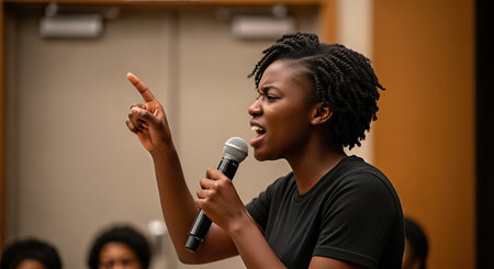 African American woman is energetically addressing an audience with a microphone, showing her passion and charisma in a lively indoor environment