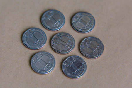 Ukrainian currency hryvnia coins on a craft paper background. Ukrainian money. Inflation, business, economics and finance theme.