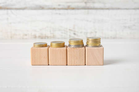coins stacking with text number on wood cube on wood floor. the managingmoney daily spending of people