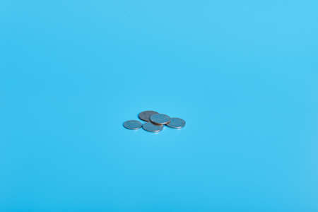 Russian coins one, two and five rubles on a blue background. Copy space.