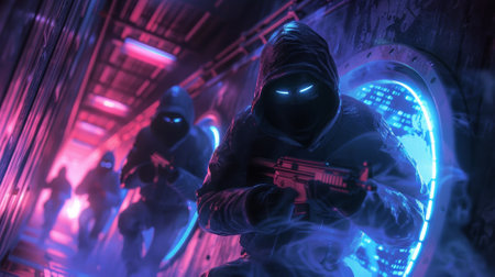 Specialist team in bright cyber attack simulation training with vibrant neon accents