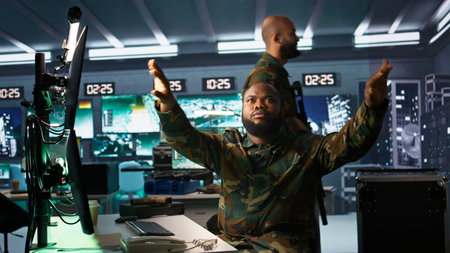 High tech military office with soldiers analyzing real time strategic data, processing intelligence to support official army operations for defense. Specialists finishing missions effectively.