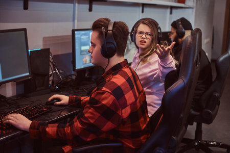 Team of young adults gamers playing in a multiplayer video game on pc in a gaming club. Success, competition, leisure time. High quality photo