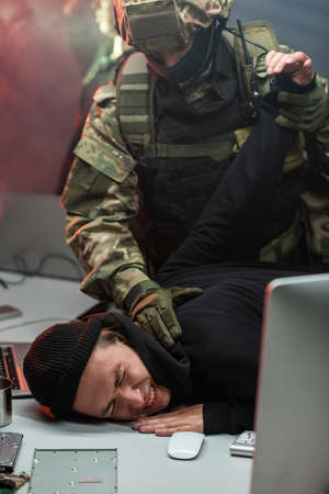 Police woman, swat member arresting armed criminal in the abandoned building.
