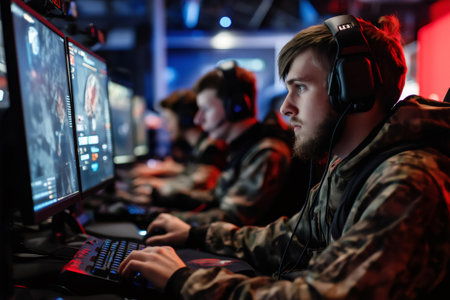 Young addicted men in headsets for online communication sitting in row and participating in cyber game