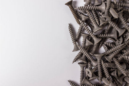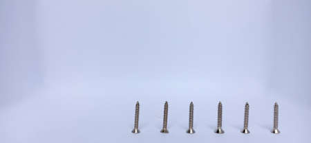 The screws are stacked on a white background with space for text or objects. taken in close-up