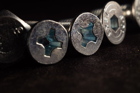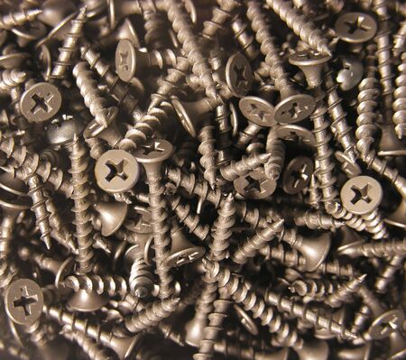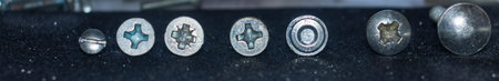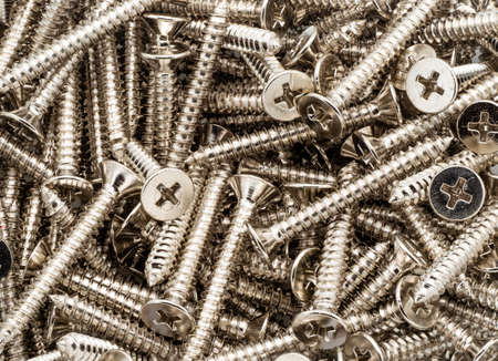 Close-up of the heads of cruciform (Phillips) steel screws for the background. Macro photography of screws Small depth of field , background screws. Abstract industrial background.