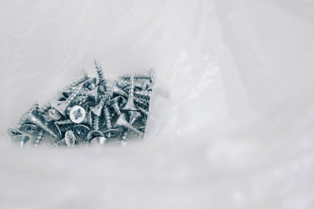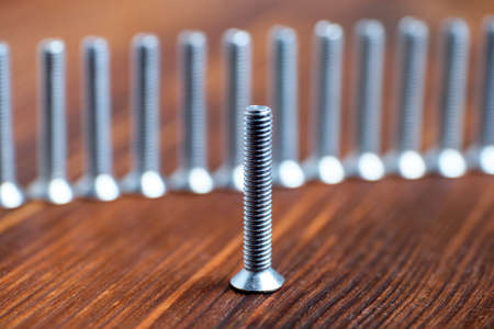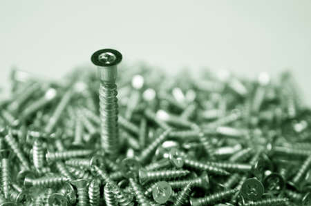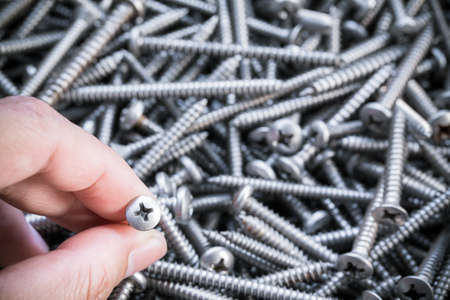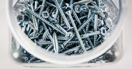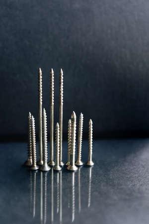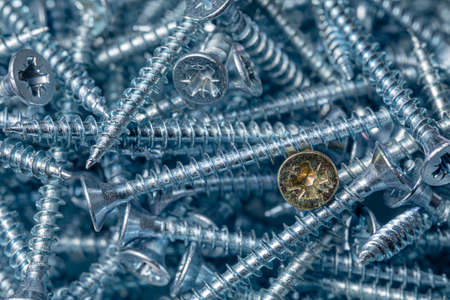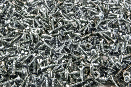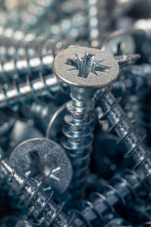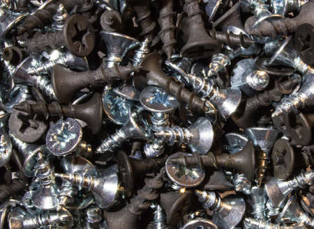 Lots of metal screws in close-up. Background of fixing tools. Macrophotography.