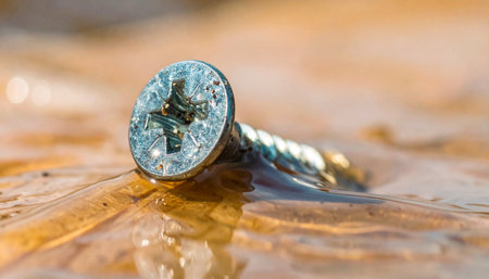 A macro shot captures the precise moment a shiny metal screw begins to join two pieces of wood.