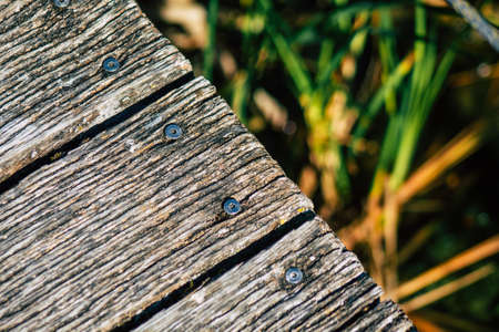Closeup of a rustic wooden bridge spanning a pond in the french countryside in the fall