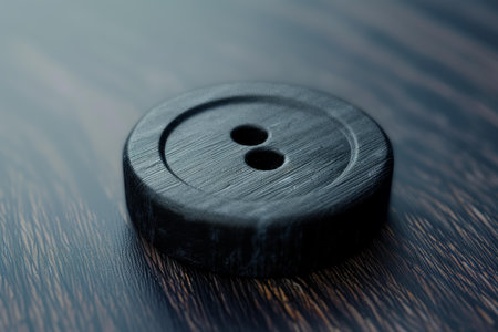 Large black button sitting on a dark wooden surface, possibly for sewing or crafts