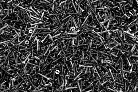 Collection of black metal screws. Metal screws background. Hardware for wood