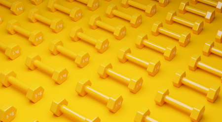 Many yellow dumbbells in a row on a yellow background, sports concept, 3d rendering