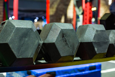 Metal dumbbells on an iron stand in a sports hall, close-up on a black background. Sports concept, fat burning and healthy lifestyle.