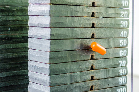 Sports equipment for bodybuilders. Close up of a black metal weight stack with a red plastic pin regulating weight