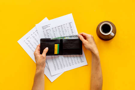 Top view of man hand paying bill at cafe or restaurant with cash, takes money banknotes from the wallet puts on the plate with receipt.
