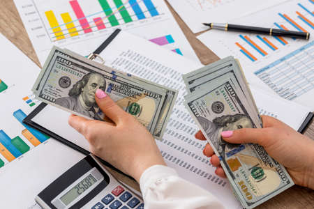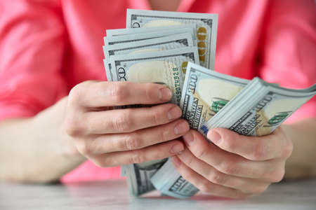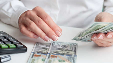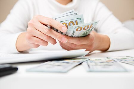 Businesswoman counting dollars at table. Financial success and business concept. close up