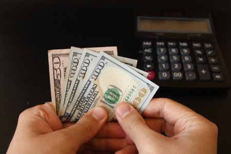 man counting US dollars money with his hand. US banknotes. The paper currency of usa .Calculator in the background.