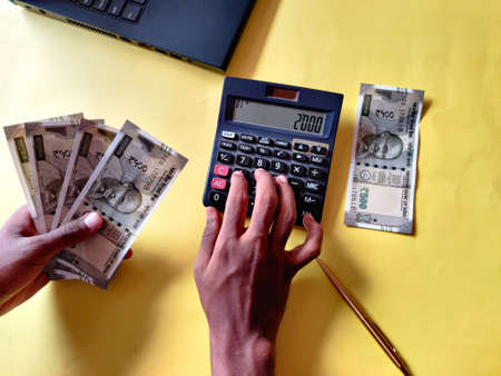 South Indian man five hundred rupees notes. Calculating bills using calculator,laptop. Yellow background