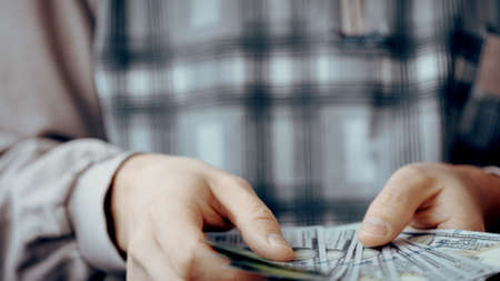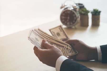 Close-up photo of businessman's hands counting cash US dollars, man working in office