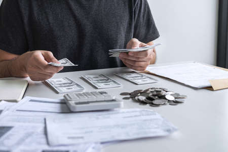 Images of stacking coin pile and Husband using calculator to calculating expenditure receipt bills of various activity cost and expenses in home office and written make report to plan of spent.