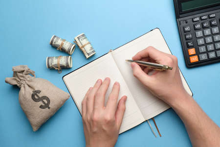 The concept of a diary with debtors. Hands with a pen on the diary next to a bag of money and a calculator